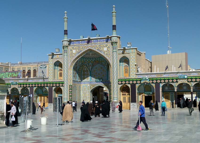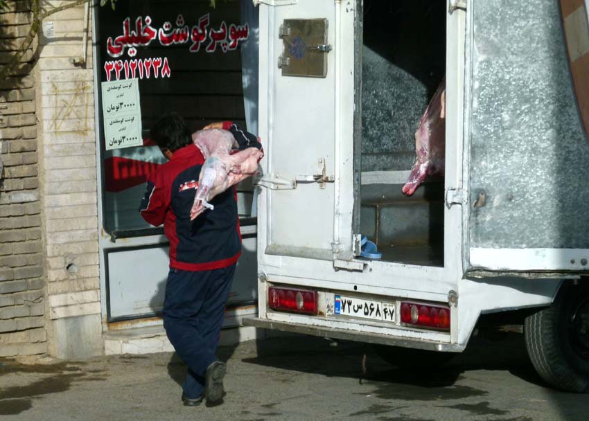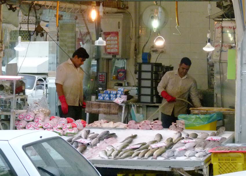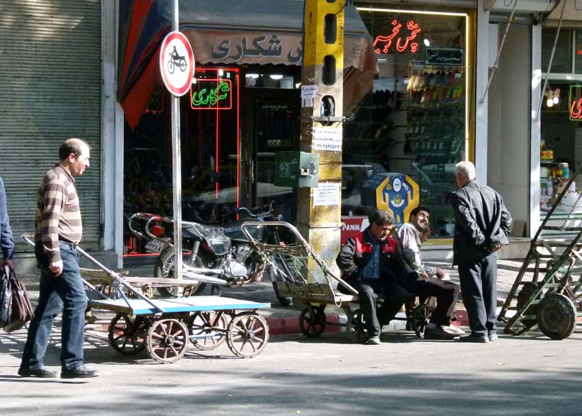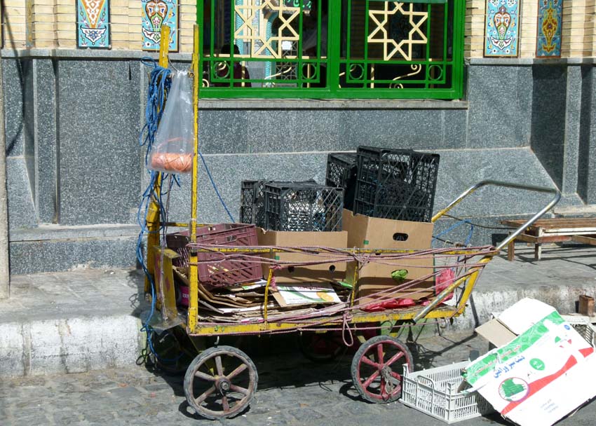 | Das Gedränge im Bazar ist gross. Vorfahrt haben immer die vielen schwer beladenen Lastkarren, welche von Hand gezogen werden. Zudem fahren in den engen Gassen noch Motorräder mit überbreiter Ladung herum. Als uns der Hunger übermannt gehen wir, weil wir gerade nichts anderes finden, in ein Fastfood Restaurant und essen Pizza und den grössten Hamburger (im Iran Sandwich genannt) aller Zeiten. Auffällig ist im Bazar die recht traditionelle Bekleidung, Frauen meist ganz in schwarz. Es hat auch Stoffläden, die nur schwarzen Stoff in allen Varianten und Mustern verkaufen. |
