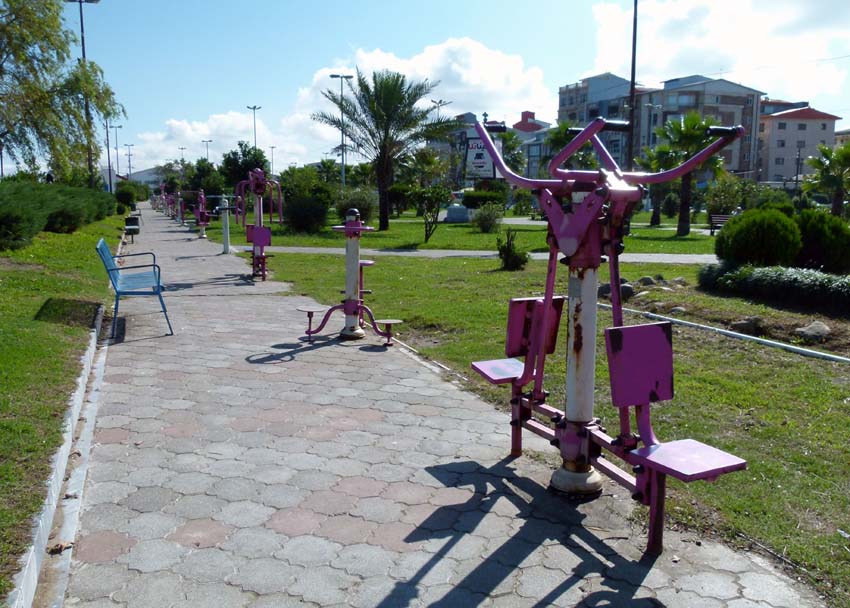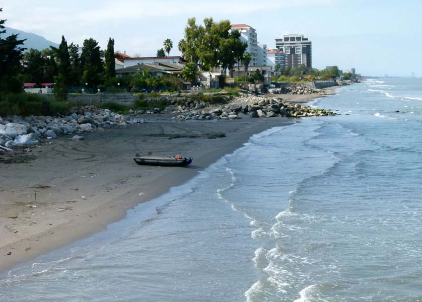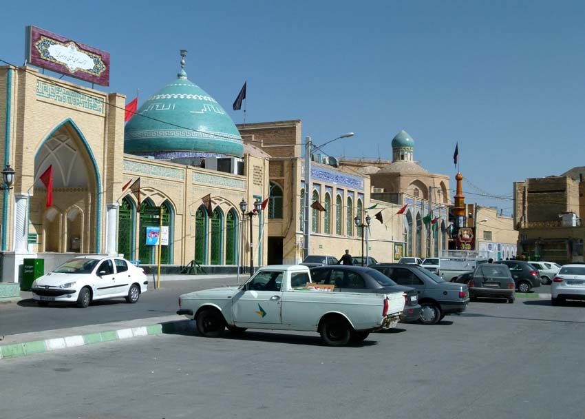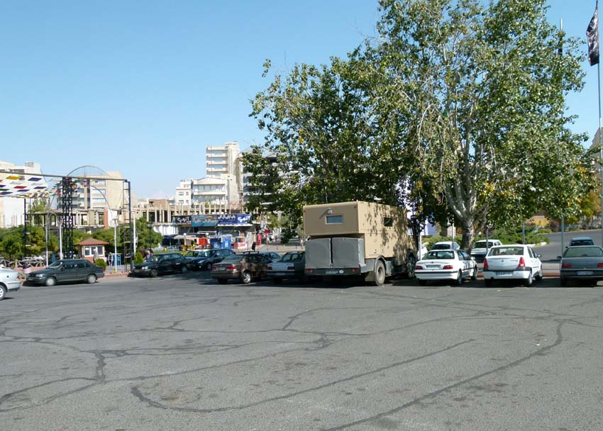 Es ist bereits dunkel und wir machen uns auf den Weg ins nahe Delijan zur Nachtplatzsuche. Es ist ziemlich schwierig bei Dunkelheit einen Platz zu finden und wieder einmal schwören wir uns, nicht mehr bei Nacht zu fahren bzw. anzukommen. Etwas ausserhalb bei einer Moschee mit Park bleiben wir, weil hier auch schon viele andere Trucks sind. Wir stehen mitten auf einem einseitig abgesperrten Kreisel. In einer endlosen Schlange fahren die Trucks die ganze Nacht vorbei, es ist etwas laut, aber für diese Nacht ok. |