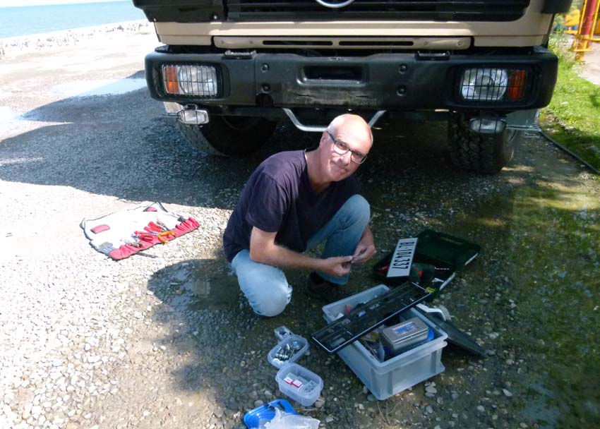 Wir werden in die Werkstatt eskortiert und dort wird schnell klar, dass eine der zwei Batterien kaputt ist und ersetzt werden muss.