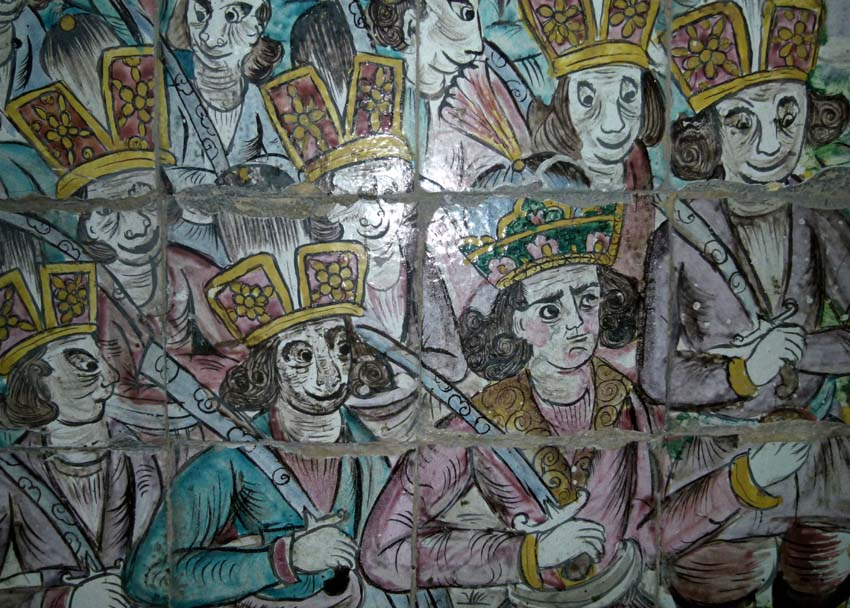 Das ist ein Haus mit reicht dekorierten Fliesenbilder in dem Passionsspiele stattfinden.