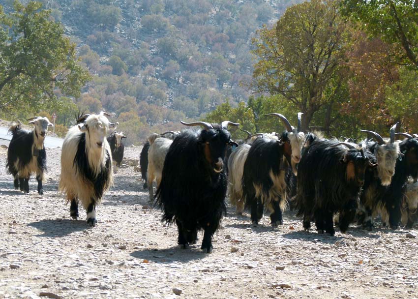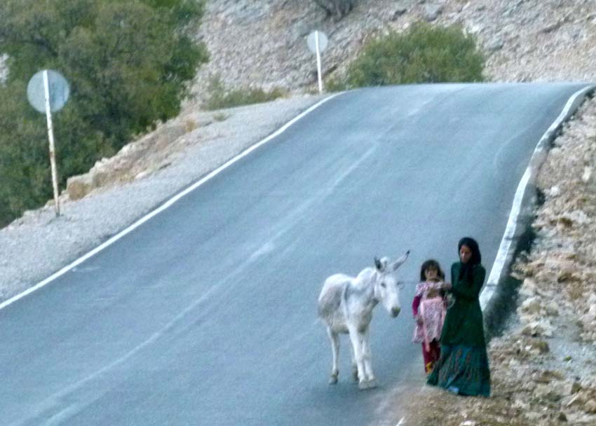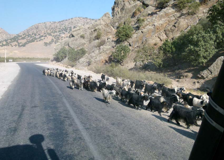 | Je weiter wir aus der Stadt kommen, desto weniger Verkehr hat es und die Strassen werden breiter. Wir nehmen die Autobahn nach Dezful (360‘000 Rial Maut). Die recht gute Autobahn schlängelt sich durch kaum bewohntes Gebirge und viele Tunnels in die Ebene am Persischen Golf. Immer wieder sehen wir mit Tierherden beladene LKWs. Die Nomaden sind auf dem Weg ins Winterquartier. Die LKWs sind alle nach einem bestimmten Schema beladen: im vorderen Teil sind die Ziegen und Schafe auf zwei Ebenen. Hinten oben in einer Ecke sitzt der Hirtenhund mit im Wind flatternden Ohren. Unter dem Hund ganz am Ende quer noch ein Esel oder Maultier. |