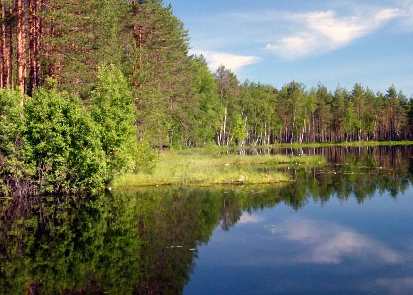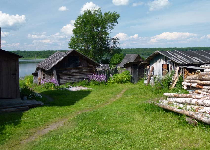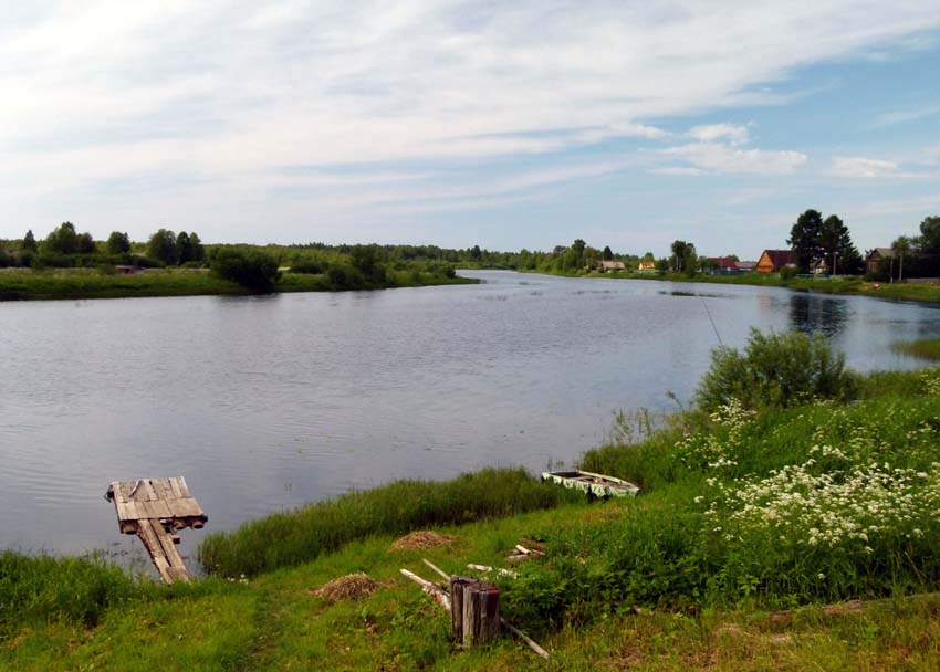 Auf unserem Weg nach Ferapontov machen wir einen Zwischenstopp bei Ryumino und finden abseits der Hauptstrasse zufällig einen wunderschönen Platz an einem grossen See. Es ist sehr friedlich hier und wir haben schönes Wetter. Abends tauchen ein paar Dorfbewohner auf, die von der nahen Brücke aus angeln. |
