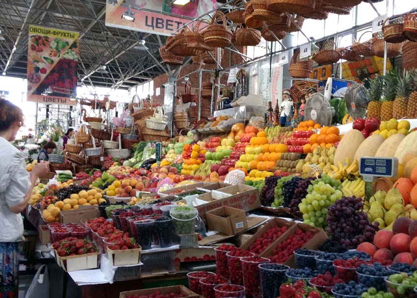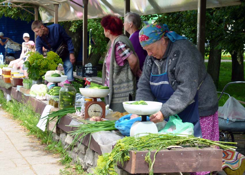 Auf dem kleinen Bauernmarkt kaufen wir wieder schöne frische Pfifferlinge (über 600 g für 300 Rubel)
