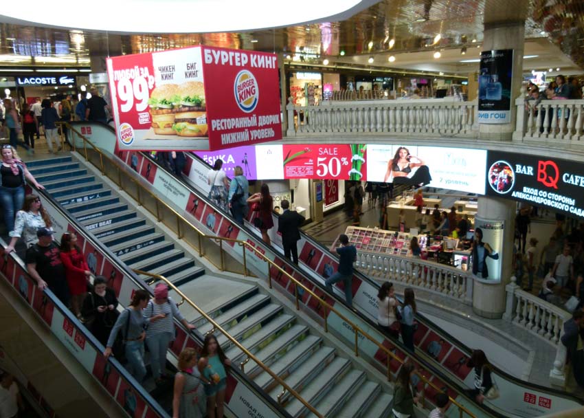 Einkaufen im günstigeren unterirdischen Kaufhaus Ochitnyj Rjad, das drei Etagen unter der Erde ist. |